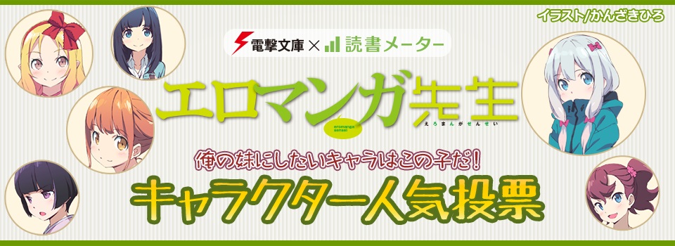 『エロマンガ先生』を発行する電撃文庫では、読書メーターと協力して最新刊の発売を記念して、「俺の妹にしたいキャラはこの子だ!」人気投票を開催。作中に登場する個性豊かな12人の女の子から”妹にしたいキャラ”No.1を決定、その結果は6月30日に放送予定のニコニコ生放送の中で発表します。