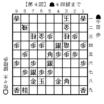 千田は▲4四銀の食いつきに△6三金には銀交換から再度▲4四銀(第4図)と打った。次に▲3三銀成△同金▲4六桂△4三竜▲3四歩が狙いだ。千田は何度も「そうか」とか「いやあ」とつぶやいている。自信なさそうな対局姿に見えた。この攻めはいわゆるスジワルだ。5六の銀も3八の角も取り残されたままで攻め駒が増えていない。
