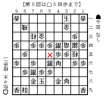佐々木は△2五桂と跳ね、▲4六角△2四銀▲2六歩に△5四歩(第5図)とじっと突いた。先手の角銀銀3枚の進路である5五のマス目を通行止めにし、さらに6三金が玉側に移動するスペースを作っている。次に△4三歩で銀ばさみだ。 敵の駒の効率を悪くし、味方の駒の働きを良くする、これぞ「筋」という手だ。
