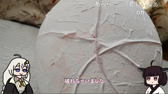 アクシデントが発生。風船に貼った和紙が破れる事態に。どうやら和紙は乾いたら縮みますが水引は縮まなかったから破れたようです。