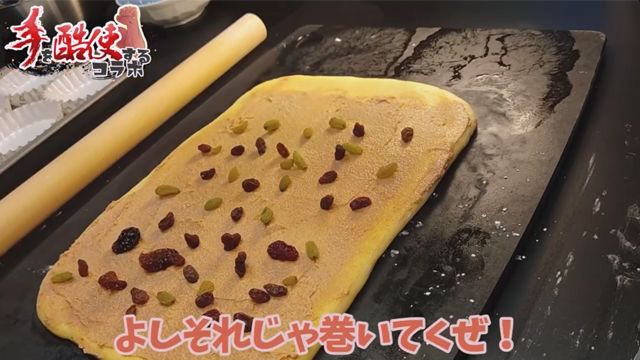 しっかり伸ばしたら、シナモンクリームを塗ってお好みでレーズンを散らします。