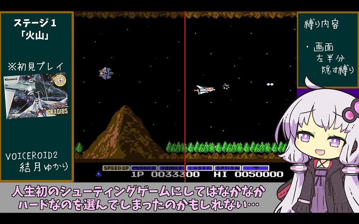 この動画は画面半分の目隠し縛りを設けた状態で、横スクロールシューティングの金字塔『グラディウス』の初見プレイに挑むというもの。