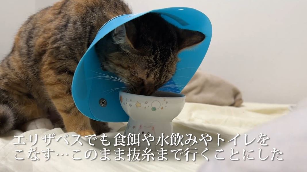 避妊手術を受け、エリザベスカラーを巻いて帰ってきた投稿者のねこかますさん宅の猫の琥麦(こむぎ)ちゃん。このままでご飯もお水もトイレもこなしました。