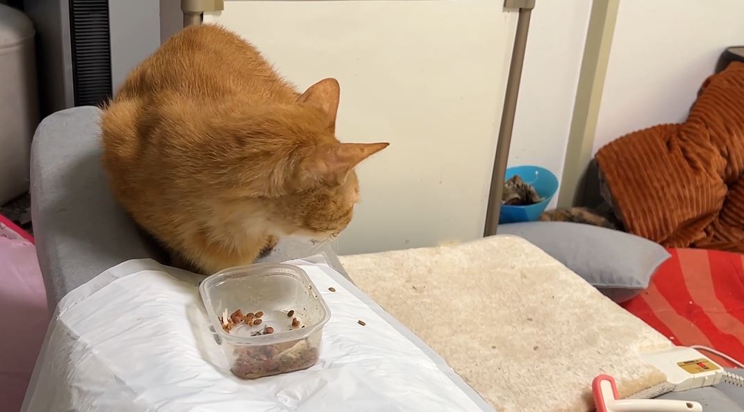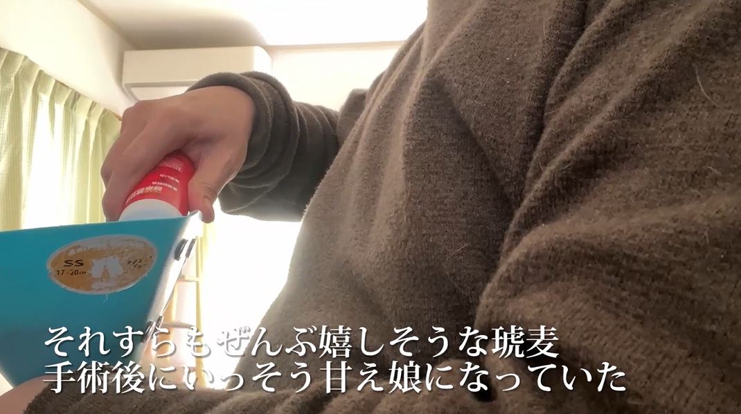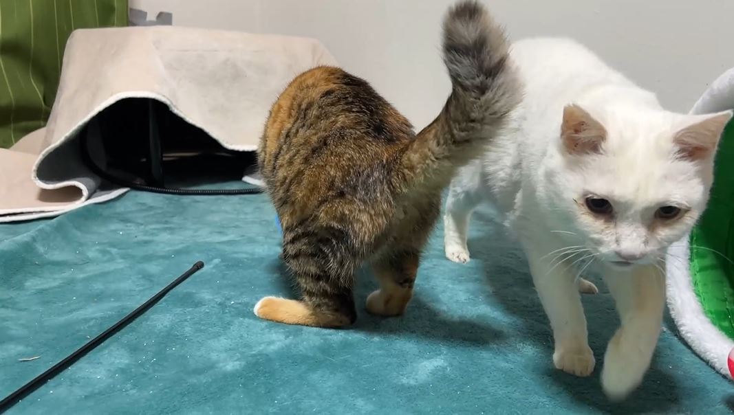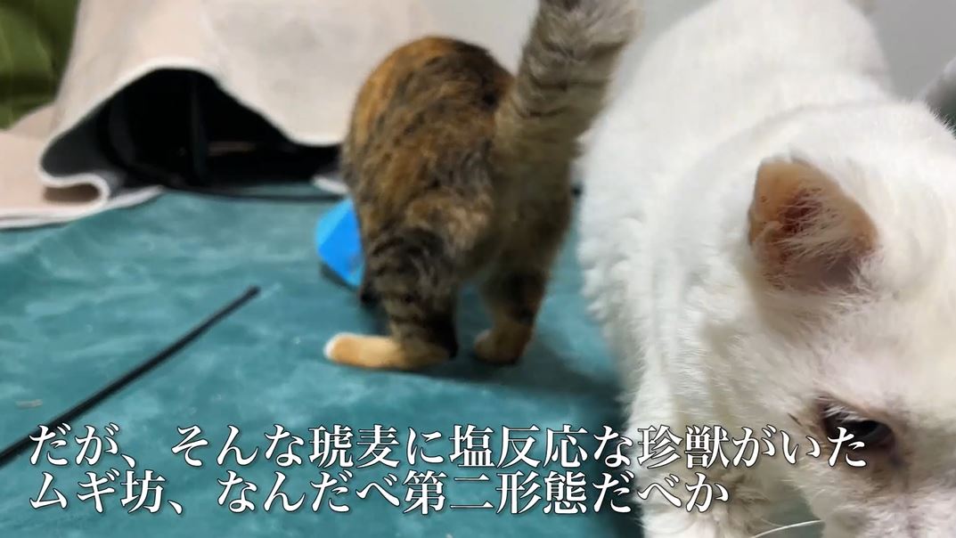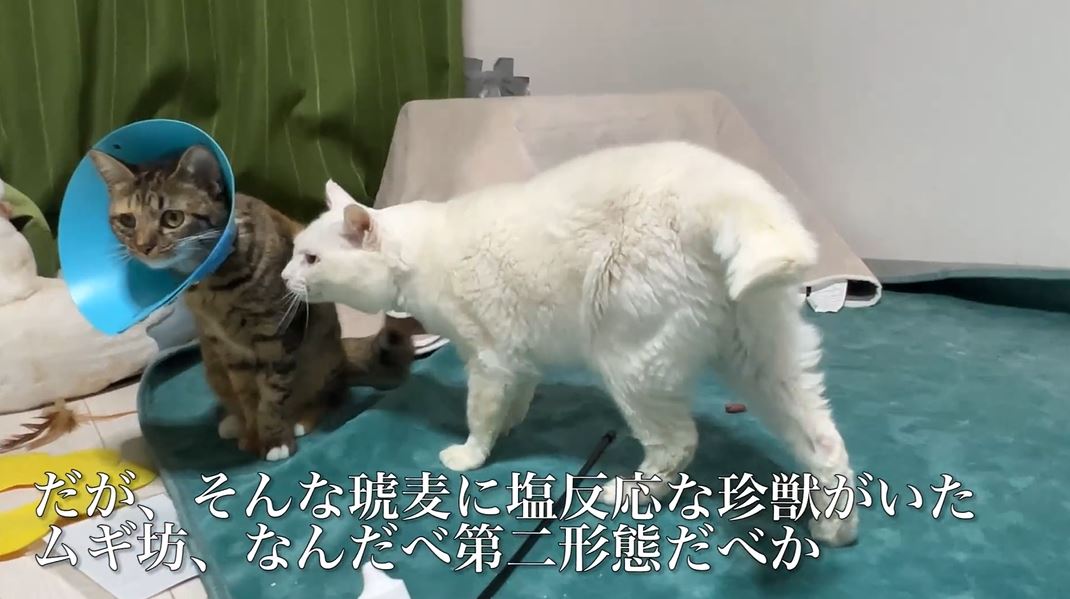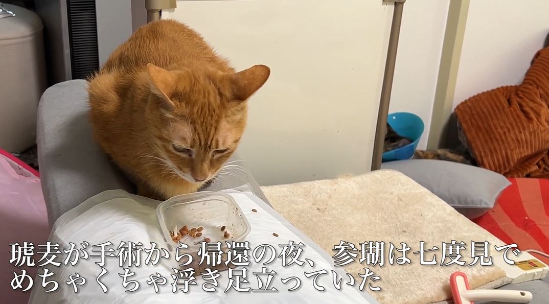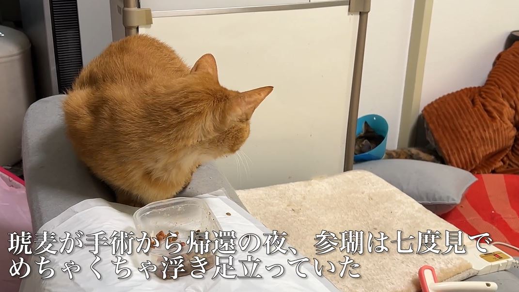 同居の猫ちゃんたちの反応はというと、寂しさでカーテンの奥に引きこもっていた茶トラの参瑚ちゃんは食餌中に何度も振り返っては琥麦ちゃんの存在を確認。とても浮足立っているそうです。