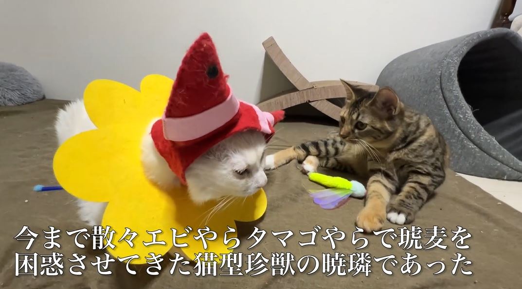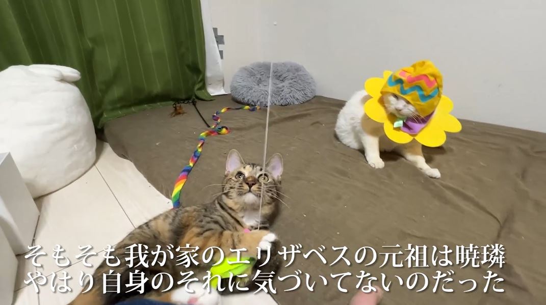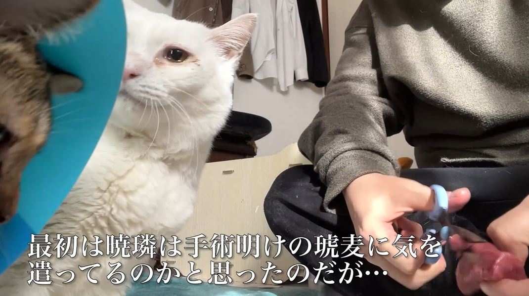 エリザベスカラーどころか被り物でこれまで琥麦ちゃんを戸惑わせてきた曉璘ちゃんなのですが、身に付けるのと見るのは違う様子。