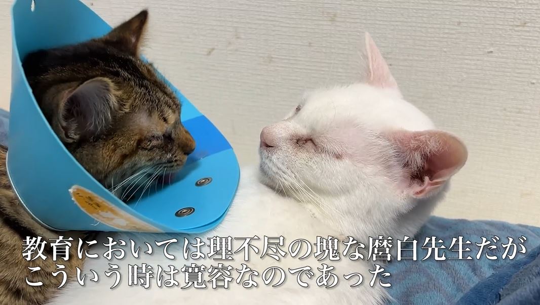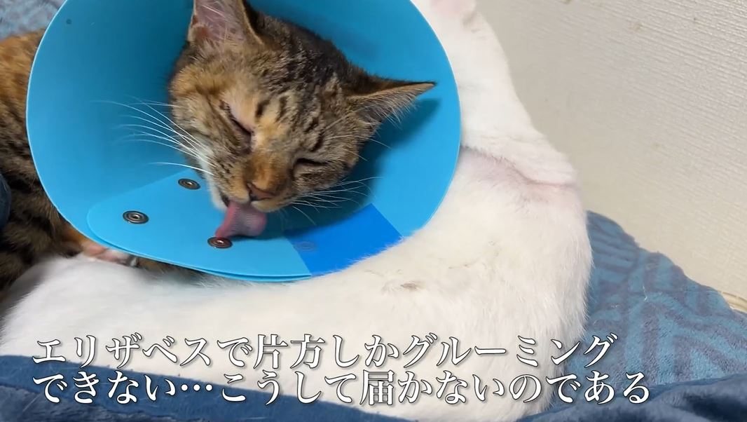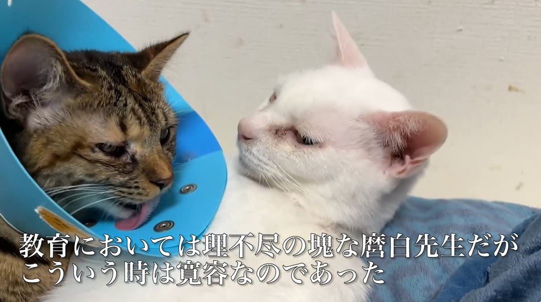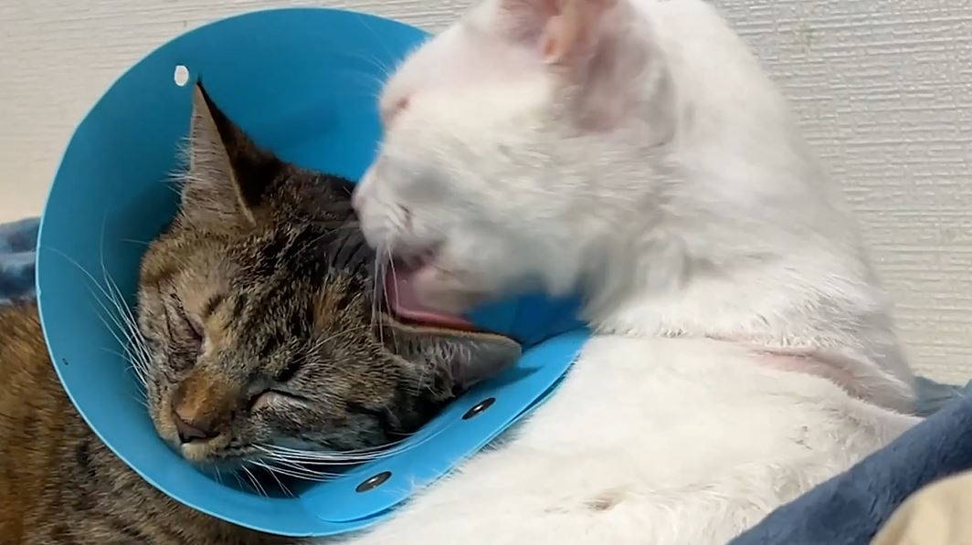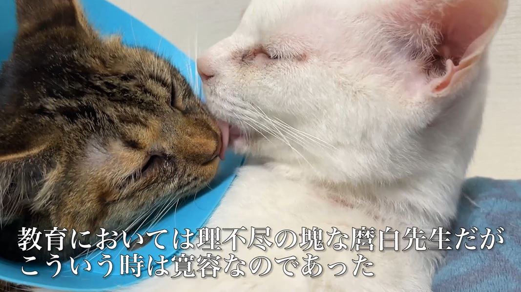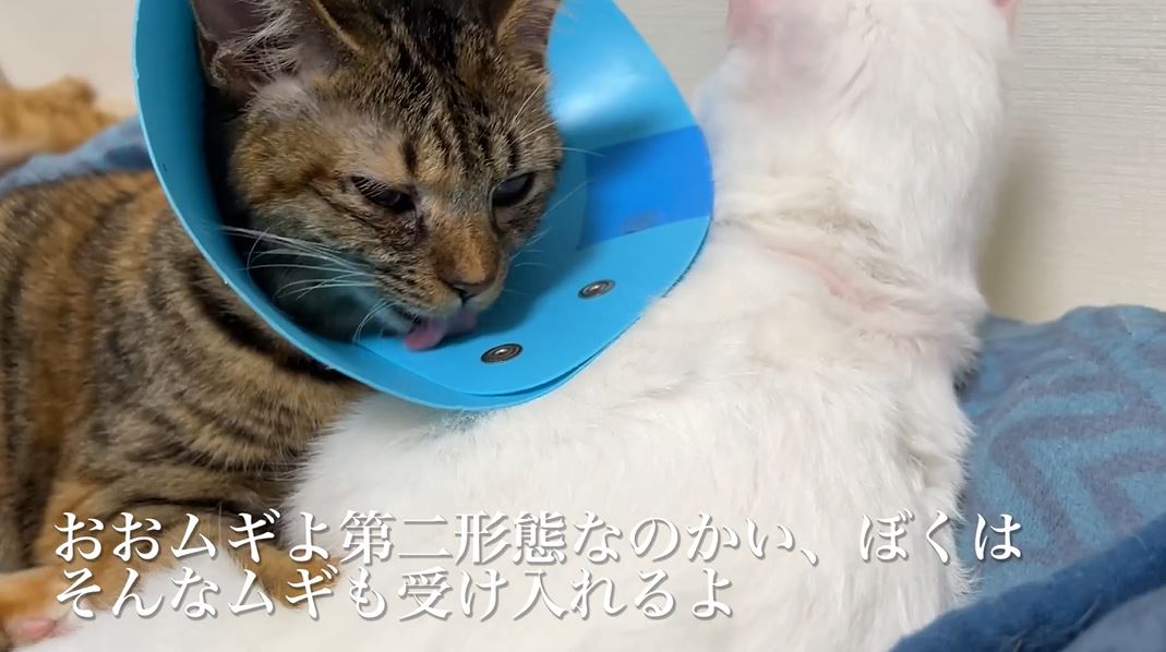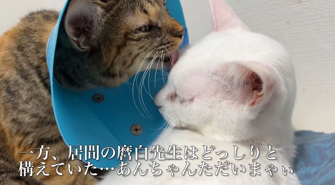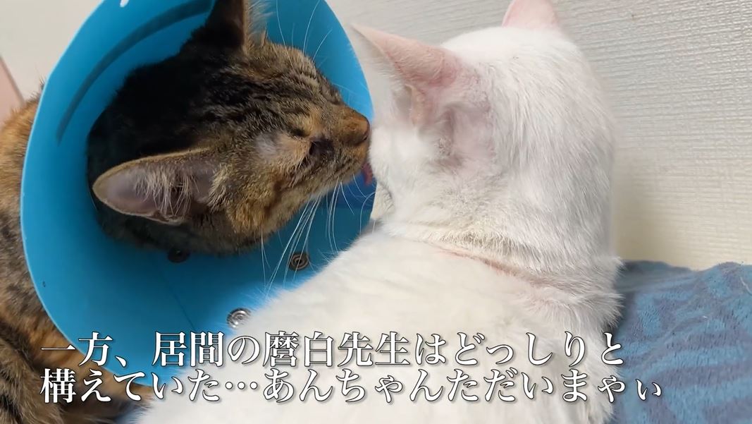 いつものようにグルーミングを続けようとするも、エリザベスカラーに阻まれた琥麦ちゃん。戸惑っているところを麿白先生がしっかりと舐めてあげます。