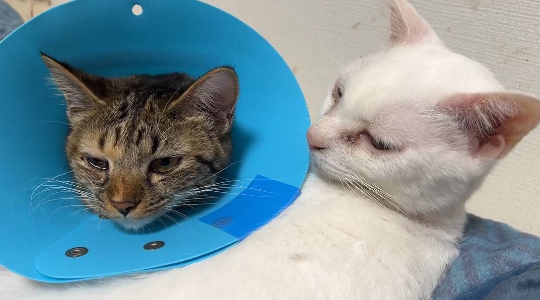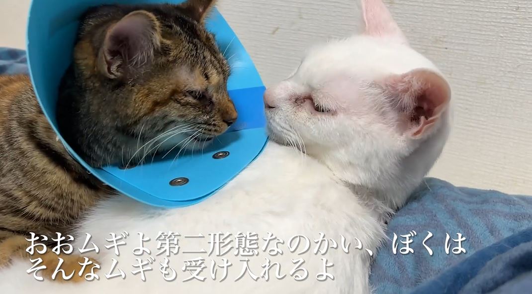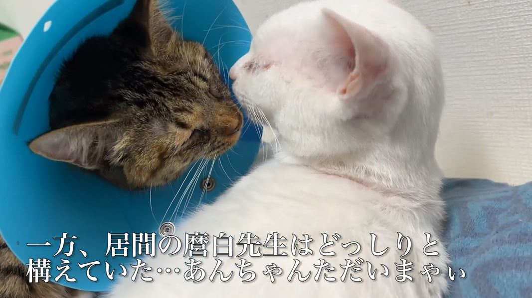 病院から帰還した子猫ちゃん! 先住猫からエリザベスカラーを乗り越えるほどの愛情を受け取る