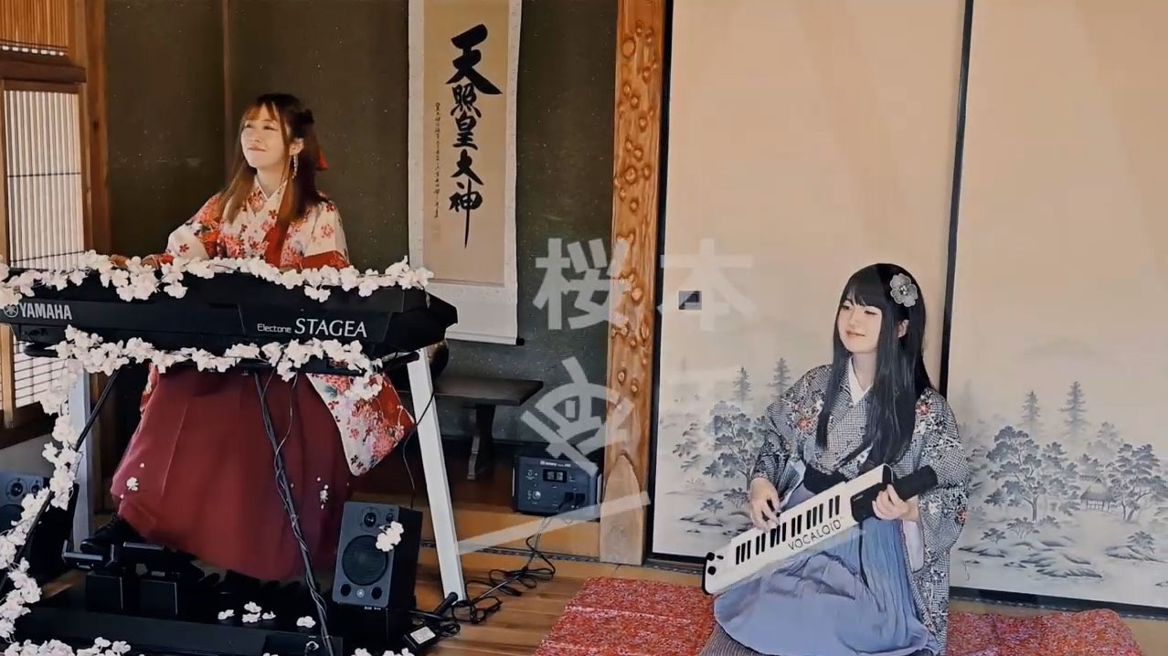 撮影場所は古い日本家屋。和室に置かれたエレクトーンは、桜で美しく装飾されています。2名の奏者は袴に身を包んでおり、楽曲の世界観をより一層引き立てています。