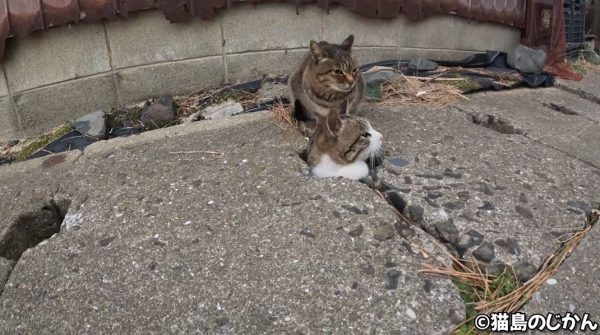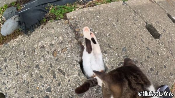 足をバタつかせる様子に思わず手を伸ばした投稿者の猫島のじかんさんですが、猫ちゃんはそのままスルンと穴の中に入ってしまいました。