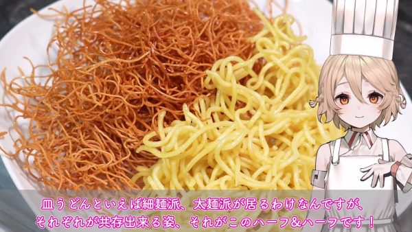 ここからさらに、“ちゃんぽん麺”の準備をします。水洗いしてほぐしたちゃんぽん麺をフライパンで焼き、軽く焦げ目をつけます。2種類の麺をお皿に盛り、細麺と太麺のハーフ&ハーフにしていきます。