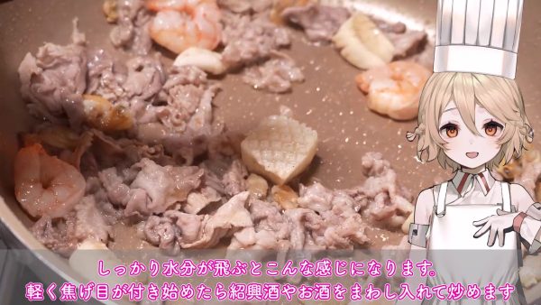 次に、あんを作ります。肉と海鮮を強火で炒め、軽く塩コショウします。しっかり水分が飛んだら紹興酒を加えます。良い焼き色がついたら、いったん取り出しておきます。