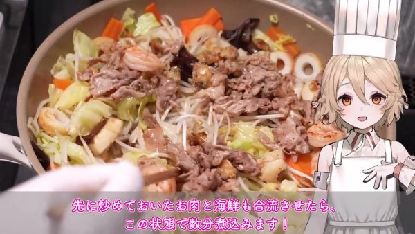 同じフライパンで残りの具材を炒め、紹興酒を回しかけてからふたをして蒸し焼きにします。もやしを加えたら、市販のちゃんぽんスープの素や水、肉や海鮮を合わせて数分煮込みます。
