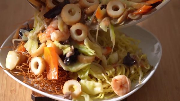生麺を揚げて作る「本格長崎皿うどん」のレシピを紹介! 揚げたてパリパリ麺ともちもち太麺をハーフ&ハーフにした贅沢な一皿