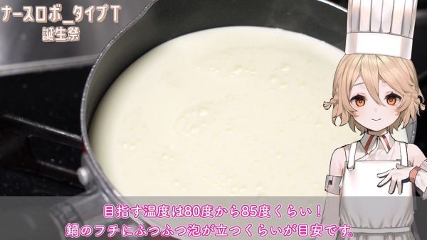 目指す温度は80度から85度くらい。鍋の縁にふつふつ泡が立つくらいが目安で、沸騰はさせません。しっかり温まると牛乳の香りからミルキーな感じに変わるそうです。