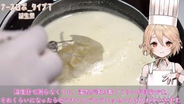 しっかり温まったら鍋ごと氷水で冷やし、60度から70度くらいに冷えたらゼラチンとバニラエッセンスを加えてよく混ぜます。温度計で測らない場合は湯気が落ち着くくらいが目安とのこと。混ざったらしっかり粗熱を取り、できれば人肌程度まで冷やしておくといいそう。