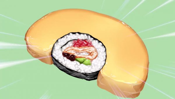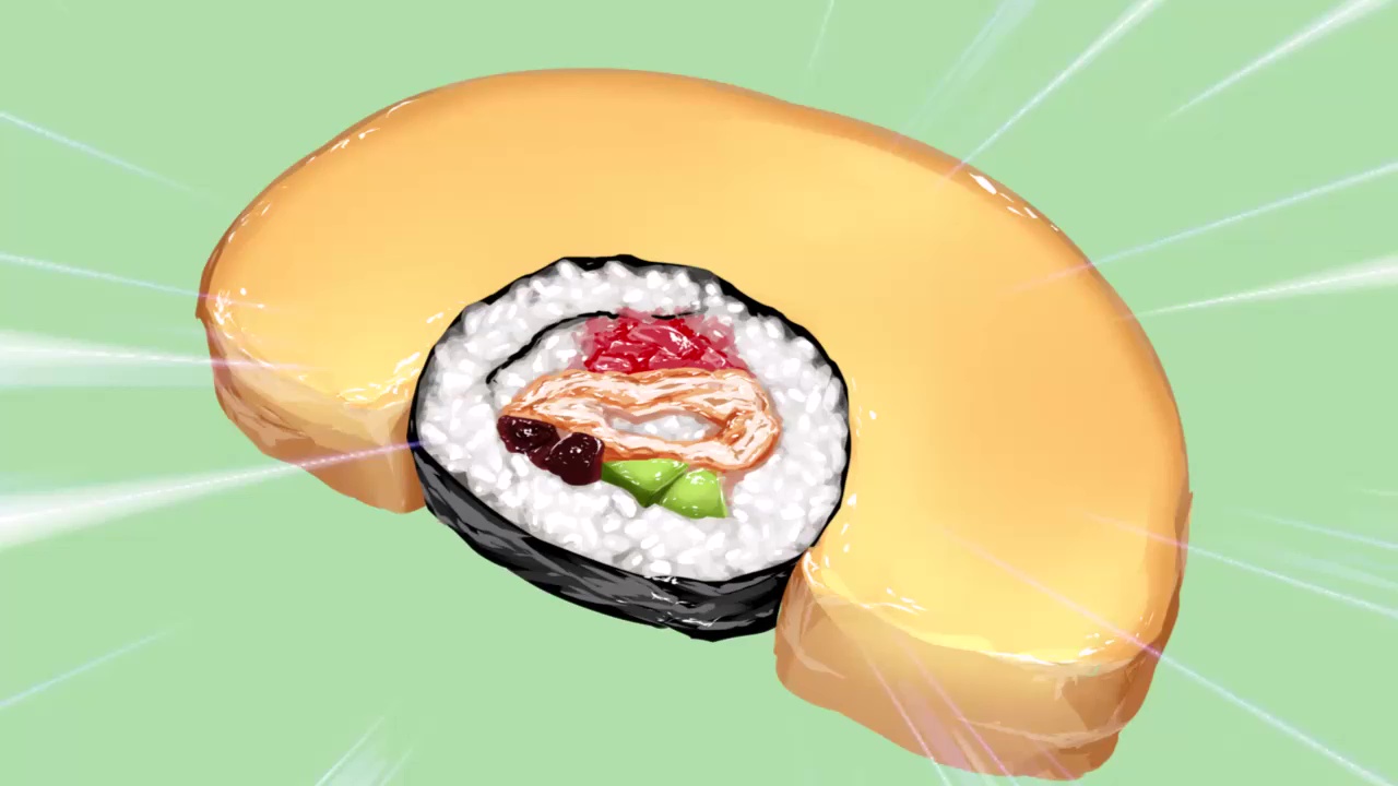 制作は、大まかな形を描くところから始まります。中央に巻き寿司、それを囲うように黄色い何かが描かれています。これが何なのかは、あとでじっくり語られます。