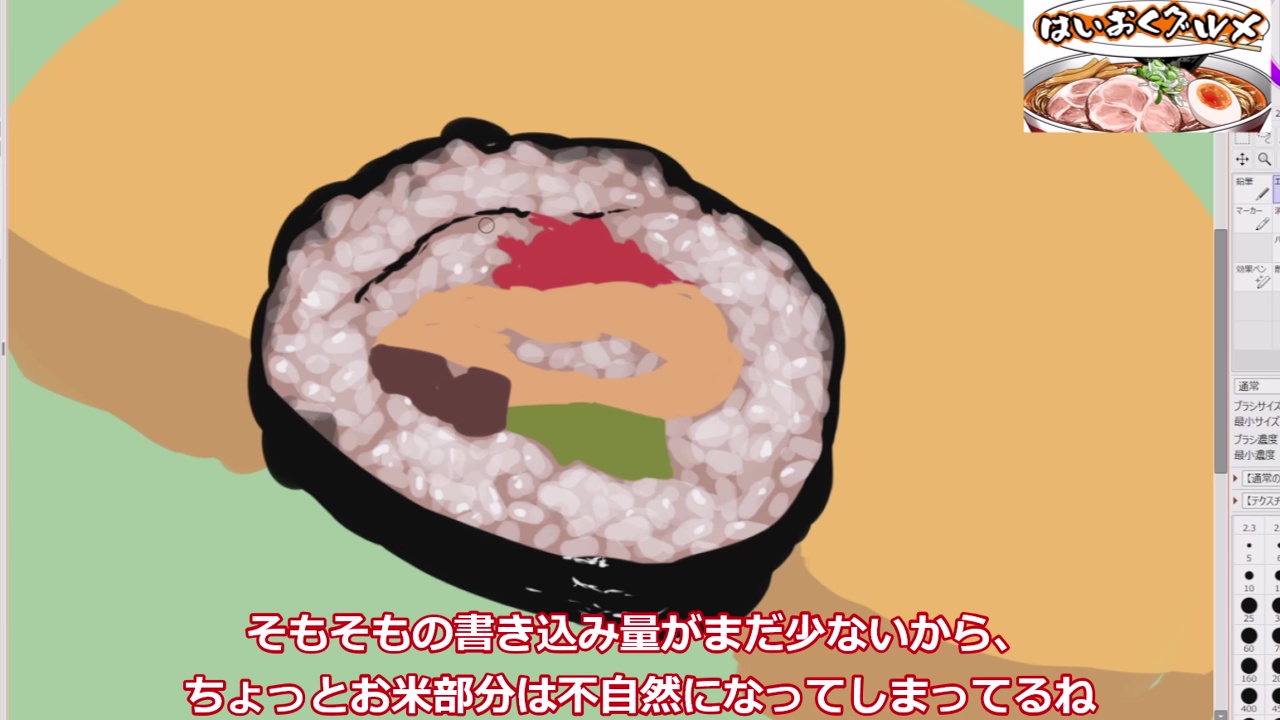 シャリは一粒ずつ描きます。その後、明るい色でお米を光らせていきます。ハイライトが入ってくるとどんどん美味しそうな見た目になってきます。