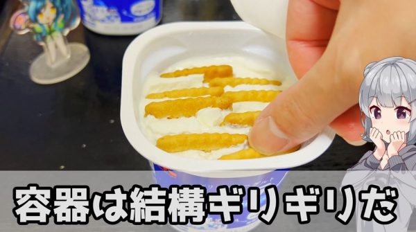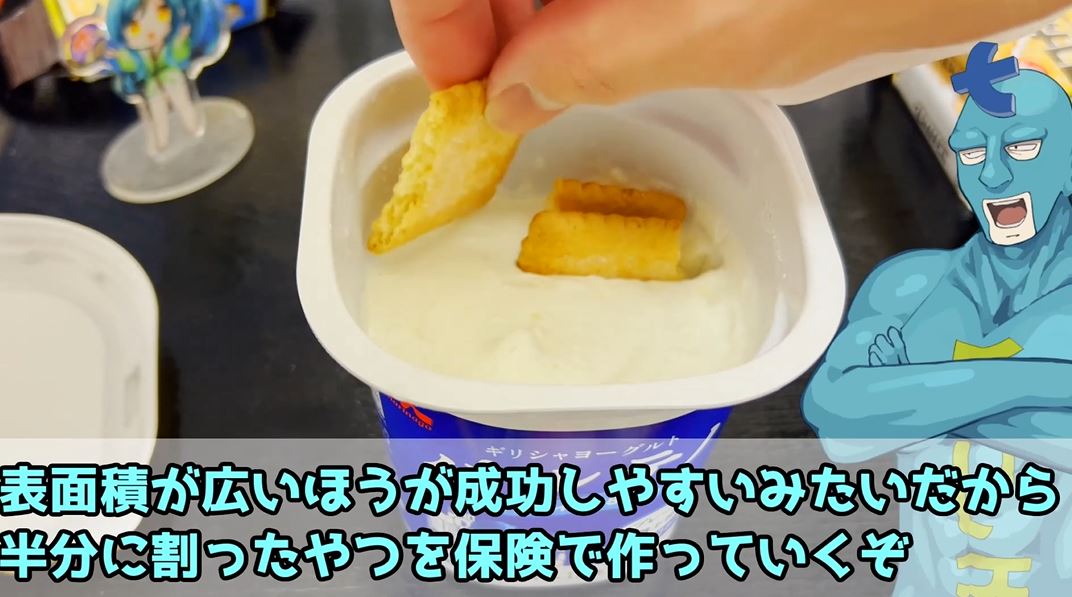 次はヨーグルトにサブレを突き刺すのですが、表面積が広いほうが成功しやすいようなのでノーマルは半分に割りました。
