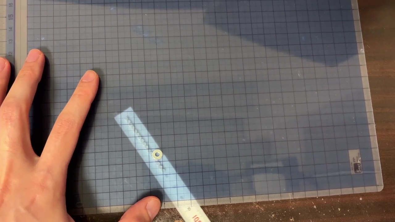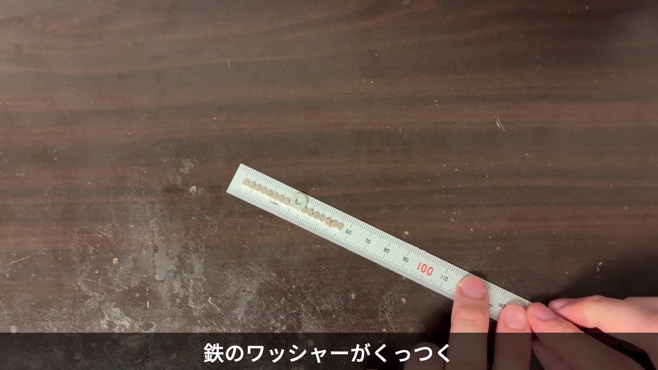 小さい磁石を鉄のスケール(物差し)の上に並べていきます。ここに鉄製のワッシャーを置くと、もちろんくっつきます。
