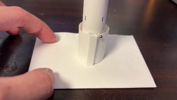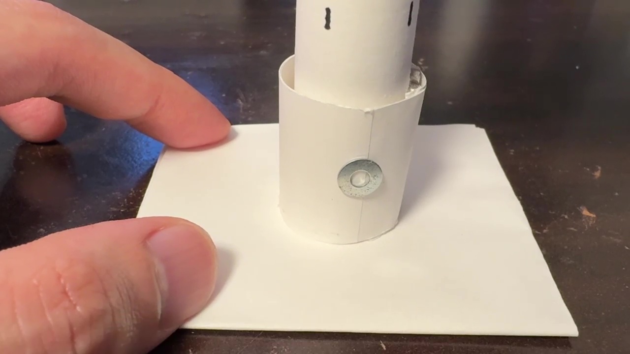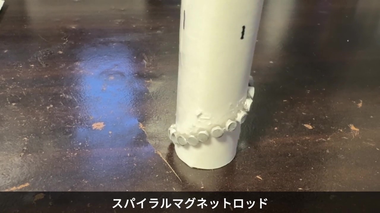 2つ目の実験です。筒にスパイラル状に磁石を貼ったものを用意します。名づけて「スパイラルマグネットロッド」。これをひとまわり大きい筒の中に入れ、外側にワッシャーを貼り付けます。