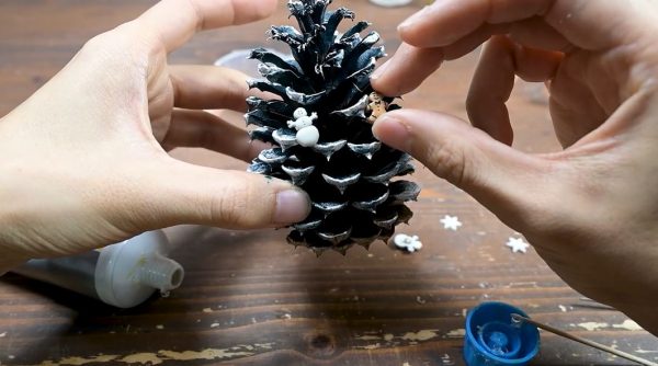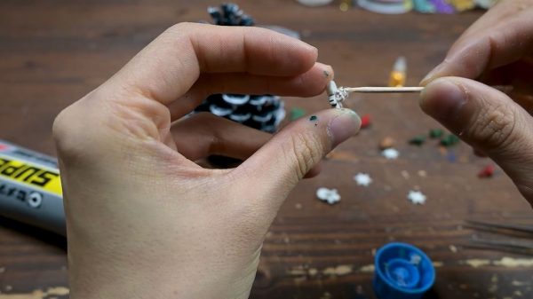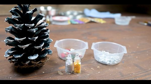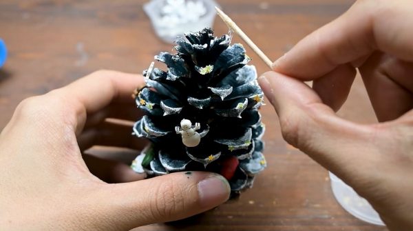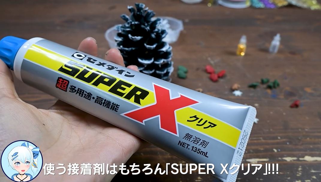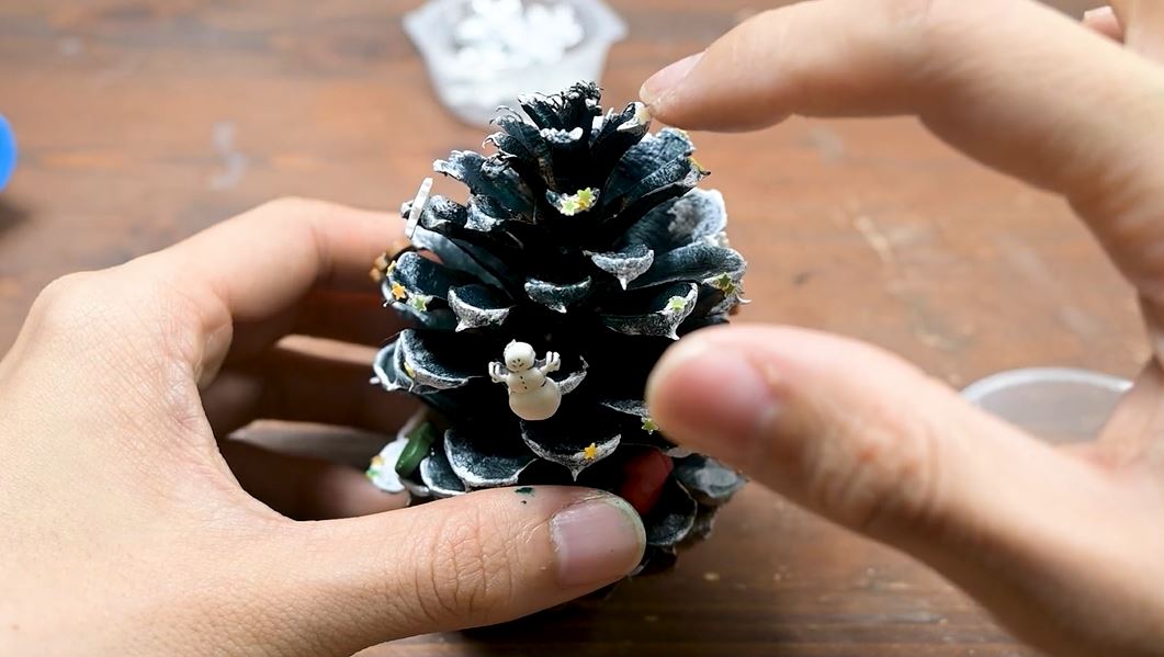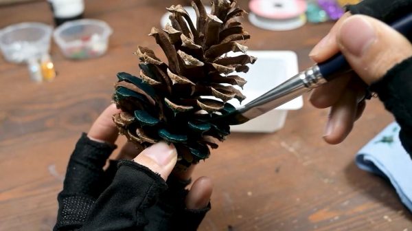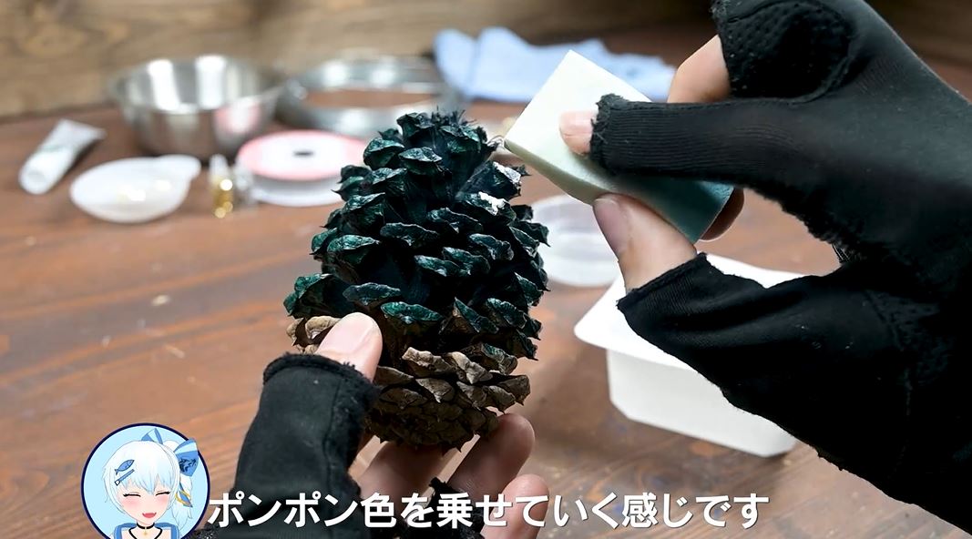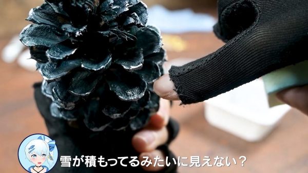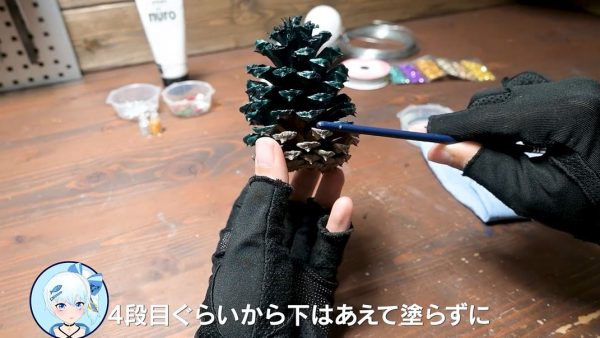 フレーク状のものは、松ぼっくりに接着剤を付けてから指先を使って貼り付けるそう。