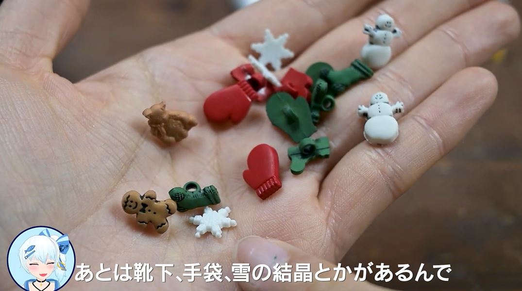 松ぼっくりに雪が積もったところでオーナメント用の小物を用意。ジンジャーマンや雪だるまや手袋などは小さな頃に買って使うタイミングの無かったボタンだそう。可愛くてピッタリです。