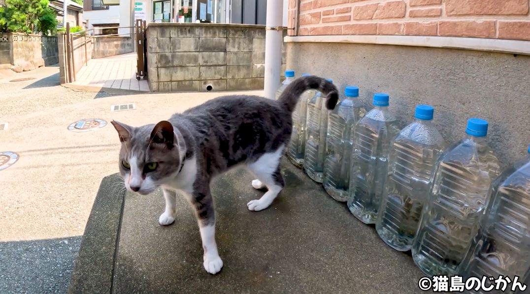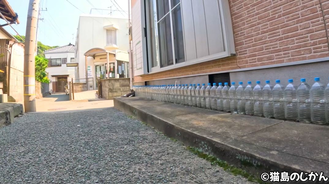ズラリとペットボトルの並んでいる家を見つけた投稿者の猫島のじかんさん。