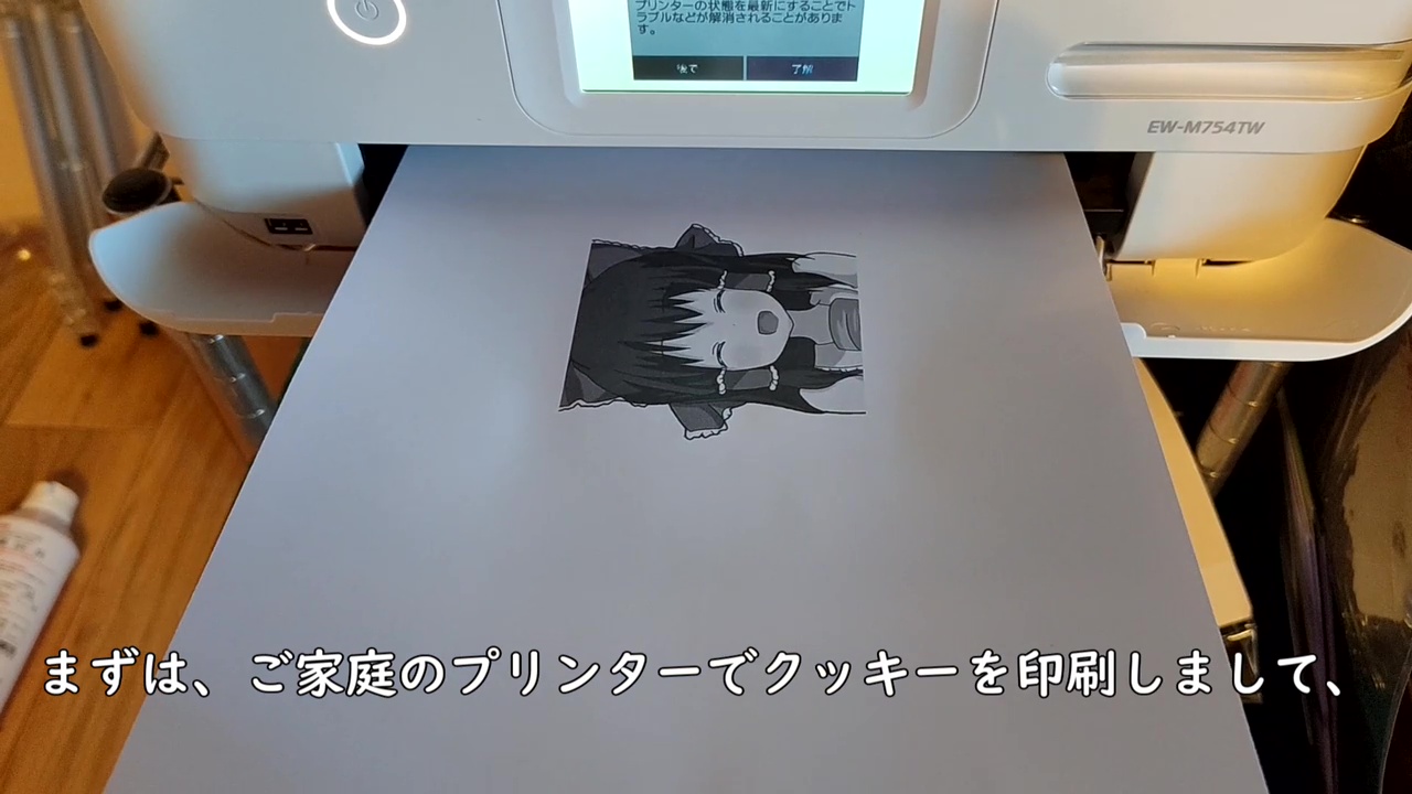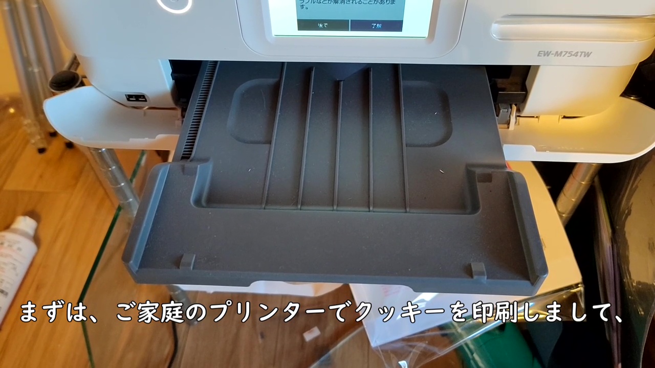 動画の冒頭に登場するのはなんと家庭用プリンター。「ご家庭のプリンターでクッキーを印刷しまして」と言いながら印刷を始めます。