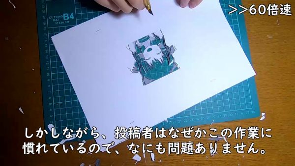 難しい作業ではありますが、切り絵動画を多数投稿している投稿者。「なぜかこの作業に慣れているので、何も問題ありません」とサクサク作業を進めます。18分ほどでできあがりました。