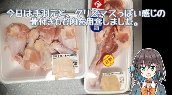 投稿者のwofさんが、「衣が薄くて表面がパリパリした食感のフライドチキン」を作ります。メイン食材は手羽元とクリスマスらしい骨付きもも肉です。
