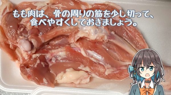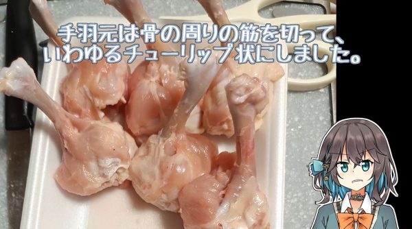 手羽元は骨の周りの筋を切ってチューリップ状にして、モモ肉は骨周りの筋を少し切って食べやすくしました。食べやすくお洒落になっています。この時点で肉の重量は633gとのこと。