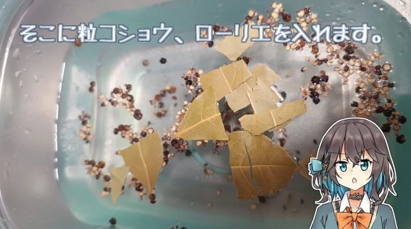 次は肉を漬け込むブライン液を準備。水1Lに対して塩40gと砂糖30gを入れ、粒コショウとローリエを加えます。人によってはニンニクやレモン、玉ねぎなどを入れたりもするそうです。
