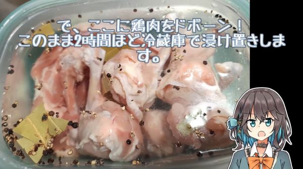ここに鶏肉を入れて2時間ほど冷蔵庫で浸け置きします。