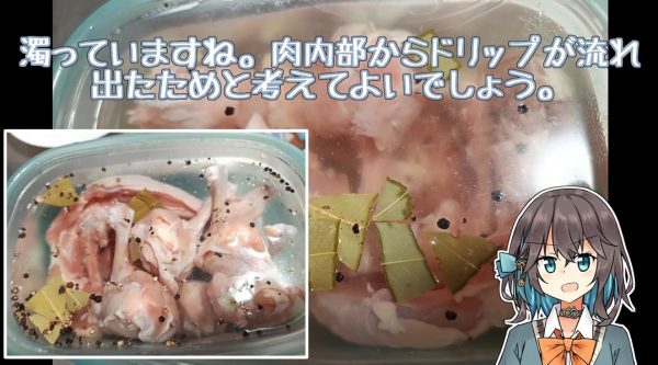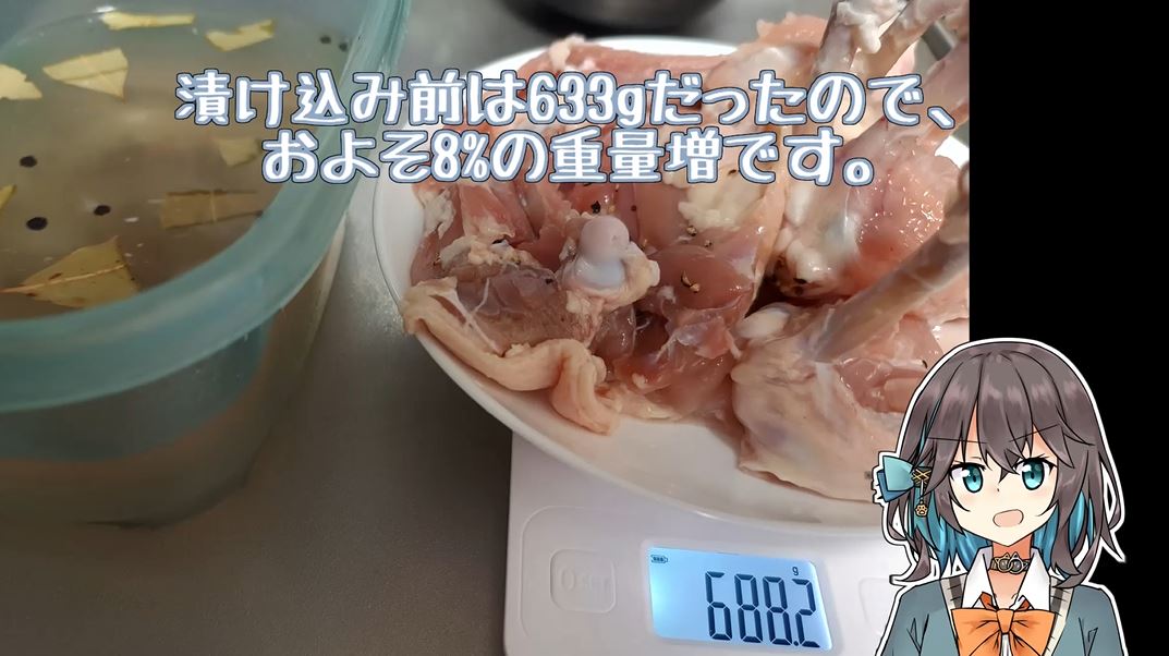 2時間後、水が濁っていました。肉内部からドリップが流れ出たようです。しかしキッチンペーパーで水分を拭き取ってから重量を計ると、688gと漬け込み前より8%重量が増加しています。動画ではwofさんがブライングの仕組みについて詳しく解説されていますので、味が沁み込みジューシーに仕上がる理由に興味を持たれた方はどうぞ動画をご視聴ください。
