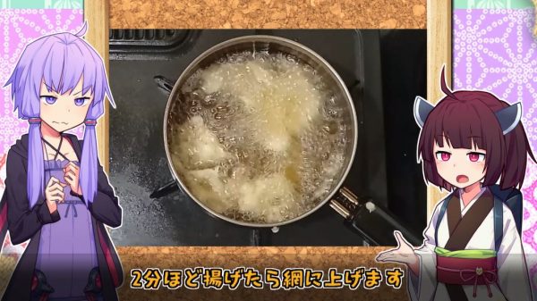 エビに衣を付けたら油に投入。2分ほど揚げて網に上げます。