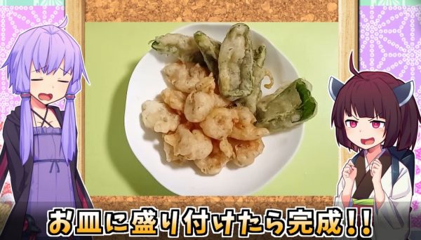 お皿に盛り付けたら完成! エビとピーマンのフリッター風です!
