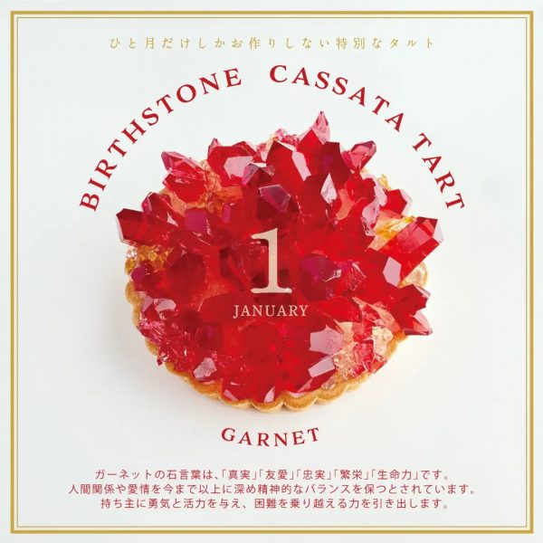 毎月販売開始すぐに完売する人気商品誕生石のタルトに、1月限定バージョンが登場。赤が印象的な1月の誕生石ガーネットを、カシス味のこうぶつヲカシでダイナミックにあしらい、まるで本物の鉱物のように仕上げました。