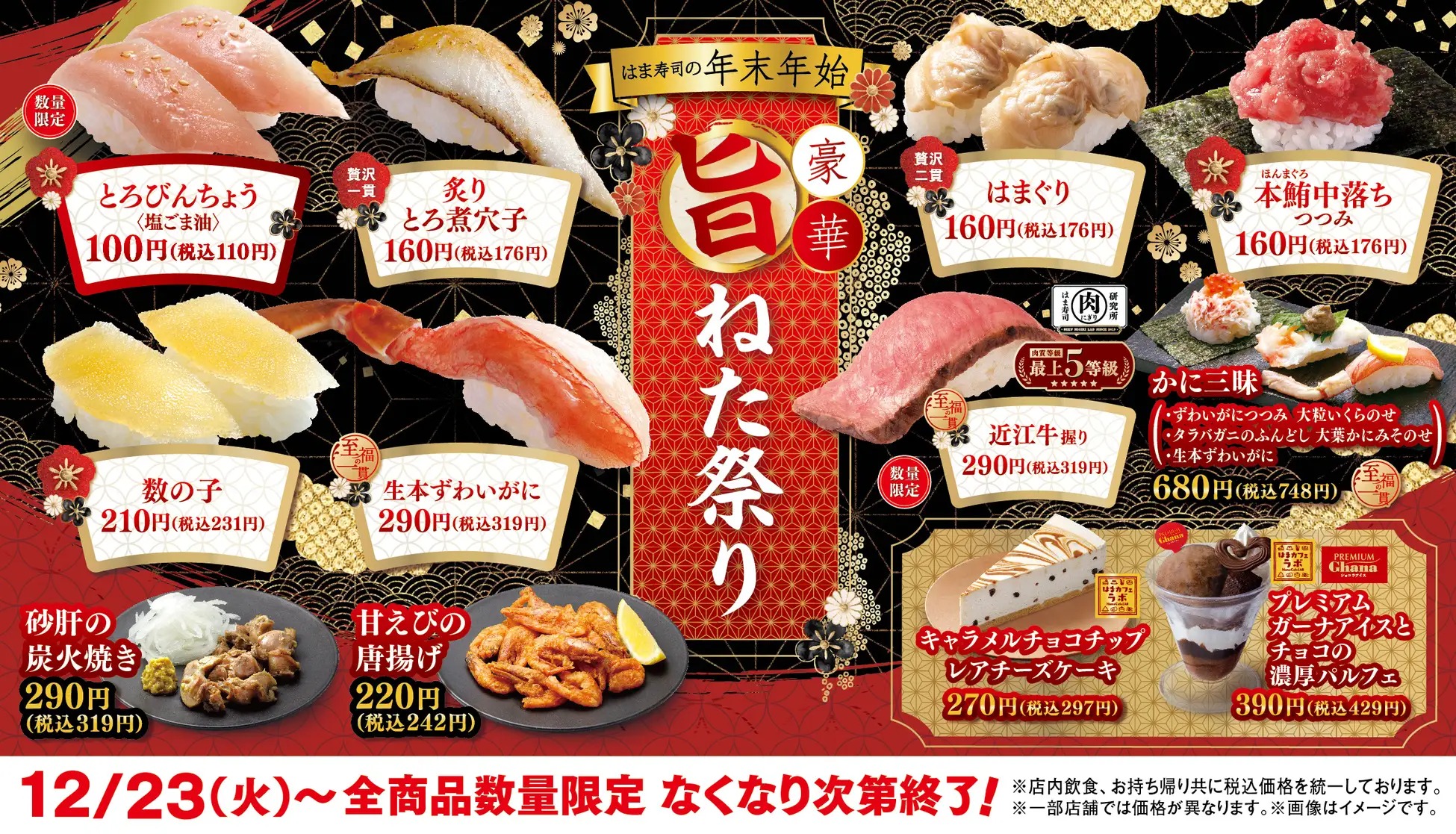 株式会社はま寿司が展開する100円寿司チェーン「はま寿司」にて、2025年12月23日(火)より「はま寿司の年末年始豪華旨ねた祭り」が開催されます。