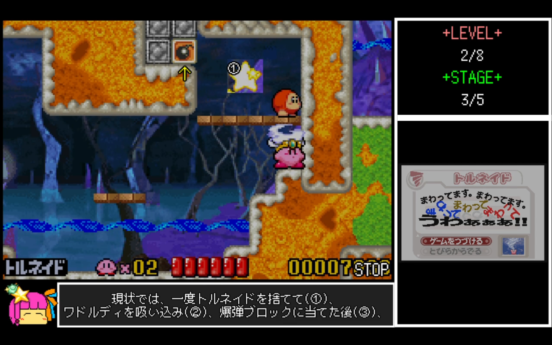動画中盤のステージではトルネイドを維持したいものの、そのままでは爆弾ブロックのギミックが突破できない状況となるが……。