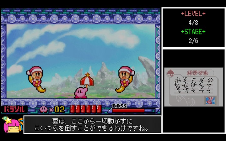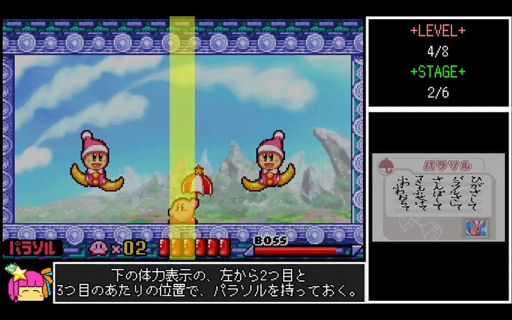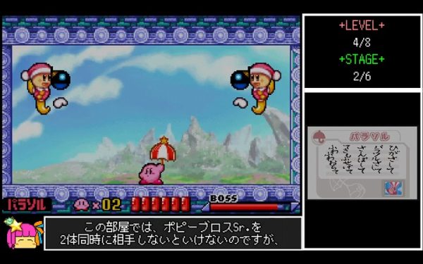 このボス戦ではいわゆる安置があるとのことで、特定の位置にパラソルを持って立つことでカービィを動かさずとも2体にダメージを与えられるという。