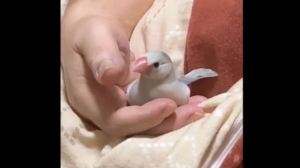 飼い主さんの手の中にやって来た文鳥さん。
