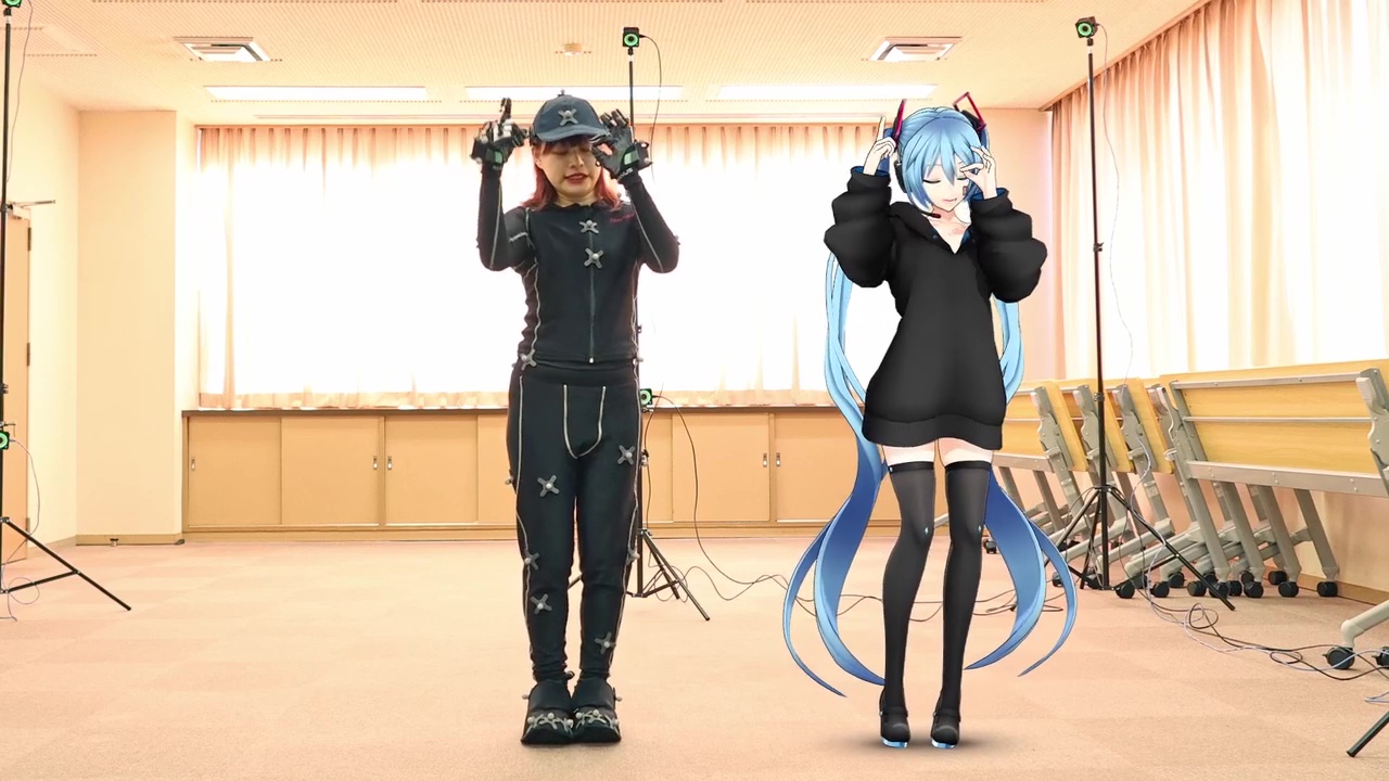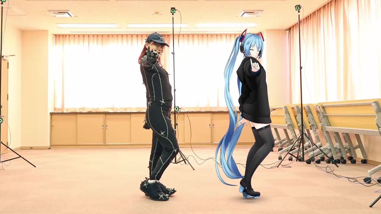 ボカロP・DECO*27さんの人気楽曲『モニタリング(Best Friend Remix)』に合わせて、初音ミクとモーションアクターが並んでパフォーマンスを披露しています。