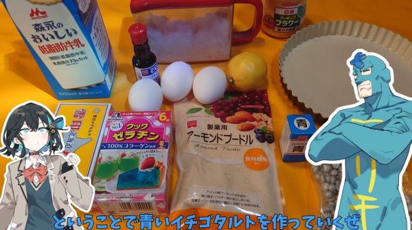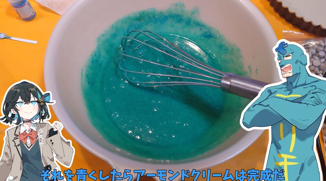 投稿者の空腹さんが青いイチゴタルトを作ります。全身をターコイズブルーのタイツで包んだ筋肉質なキャラ、フリモメンの誕生日を祝ってだとか。