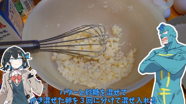 まずはバターと砂糖を混ぜて、溶き卵を3回に分けて混ぜ入れました。