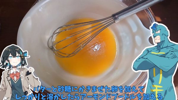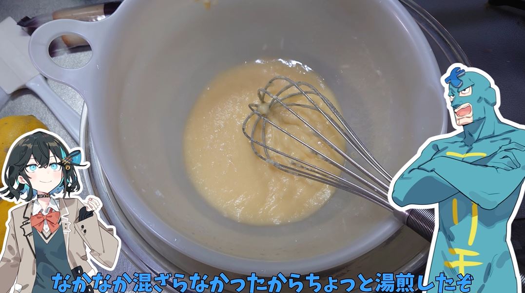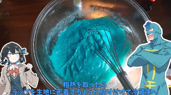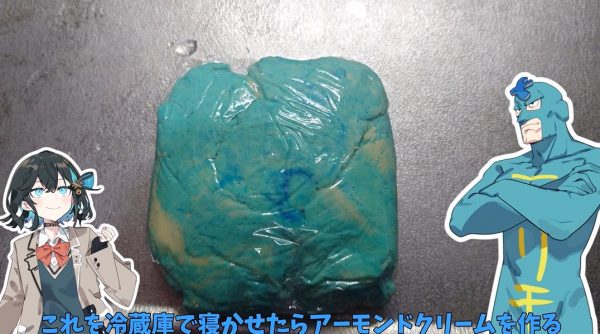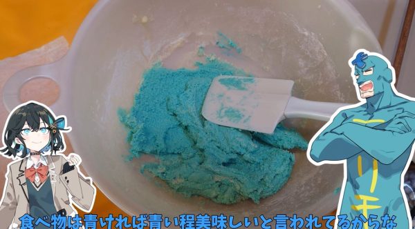 フリモメン仕様にするため、小麦粉とともに青の着色料を入れて生地の完成。曰く、「食べ物は青ければ青いほど美味しいと言われているからな」。