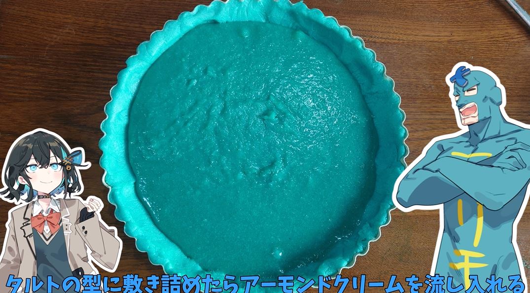 タルト型に生地を敷き詰めたら、アーモンドクリームを流し入れます。鮮やかな青ですね。生地にはあらかじめフォークで穴を開けたとのこと。