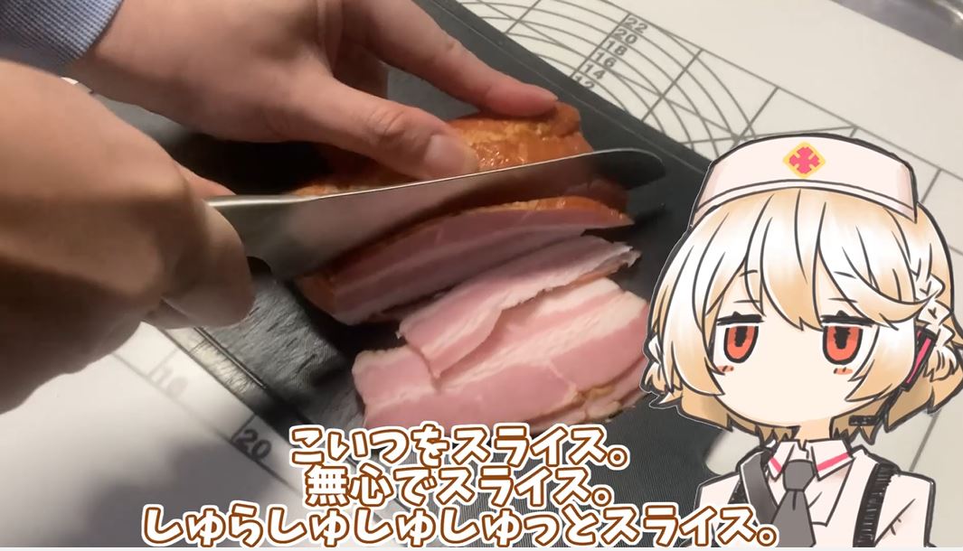 次に取り出したのは立派なベーコン。無心でスライスします。
