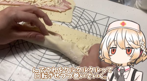 ベーコンを並べたらピザ用チーズを散らし、パルメザンチーズもかけたらクルクルと巻いていきます。