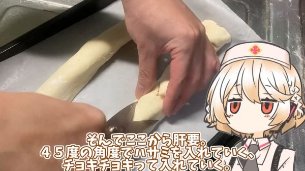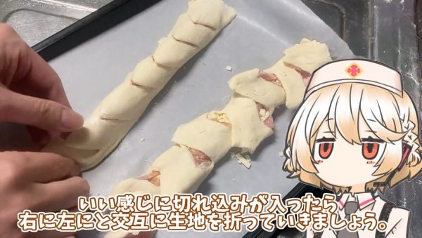 巻いたところで45度の角度でハサミを入れました。切れ込みを交互にすることで、ベーコンエピの名前の由来「麦の穂(フランス語でエピ)」の形にします。