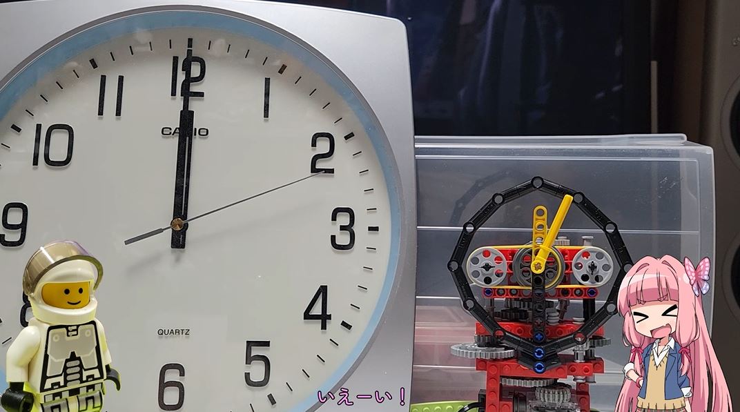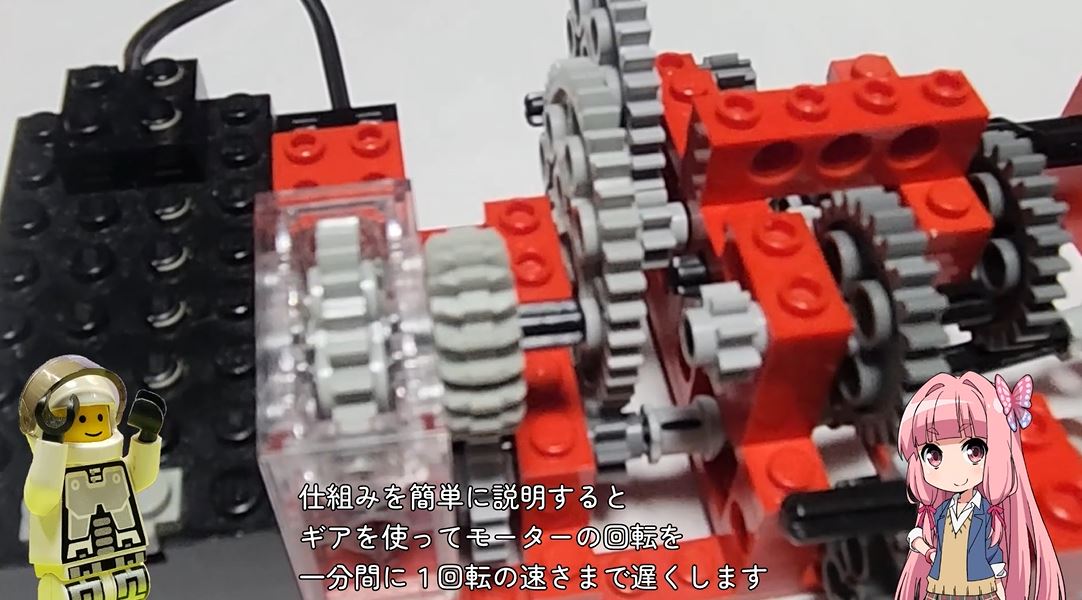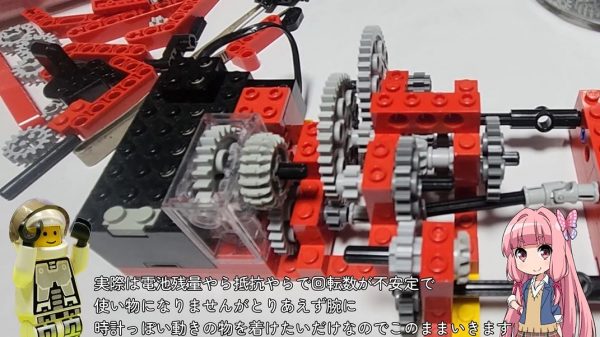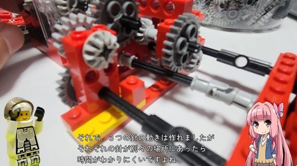 そうして作ったものがこちら。まずはギアを使ってモーターの回転を1分間に1回転の速さまで遅くしました。これが「秒針」です。次はこの秒針から動力を取って60分で1回転する「分針」に。最後は分針から720分で1回転する「時針」を作ったとのこと。